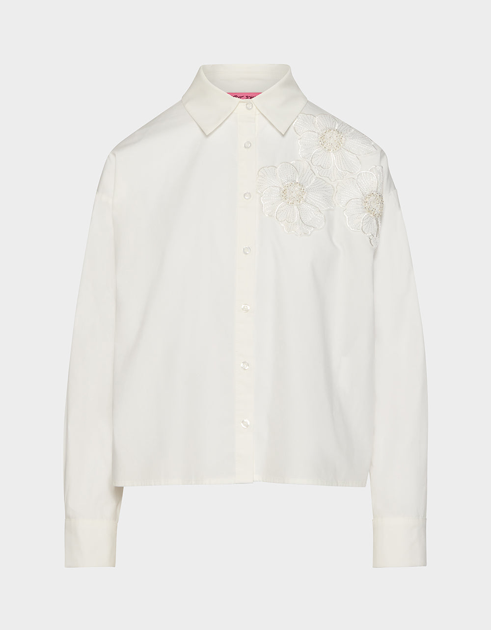 Meet your new wardrobe essential—the Betsey Bloom Shirt in Off White. This classic collar button-down shirt gets a playful twist with delicate floral and sequin detailing that catches the light beautifully. Perfect for dressing up your everyday look or adding a touch of sparkle to any occasion, it’s the versatile piece you’ll reach for again and again.