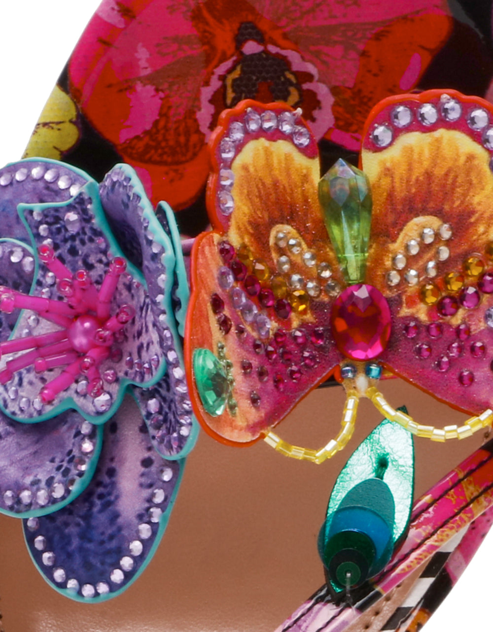 Step out in style with the CAMILE BLACK MULTI heel, where playful 3D floral designs bloom in every step. Sparkling rhinestones catch the light for a delightful shine, while a charming butterfly detail adds a whimsical touch. These heels turn any outfit into a celebration of fun and flair.