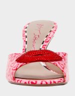 Step out in style with the CASIDY PINK MULTI mules, featuring a fun heart print and a dazzling large rhinestone lip. These bold heels slip on easily and instantly add a playful sparkle to any outfit, perfect for turning heads wherever you go.