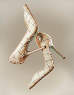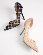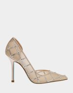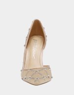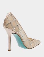 will sparkle as you walk into the night! This pump has rhinestones & peals in a lattice pattern with a pointed toe.