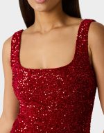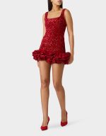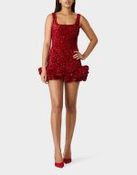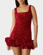 Shimmer into the spotlight in this playful sequin mini dress that’s ready for anything. The square neckline flirts with fun while ruffled hem detailing adds movement and sass. Whether you’re celebrating a special occasion or turning heads on date night, this festive red number delivers sparkle and style in one irresistible package.