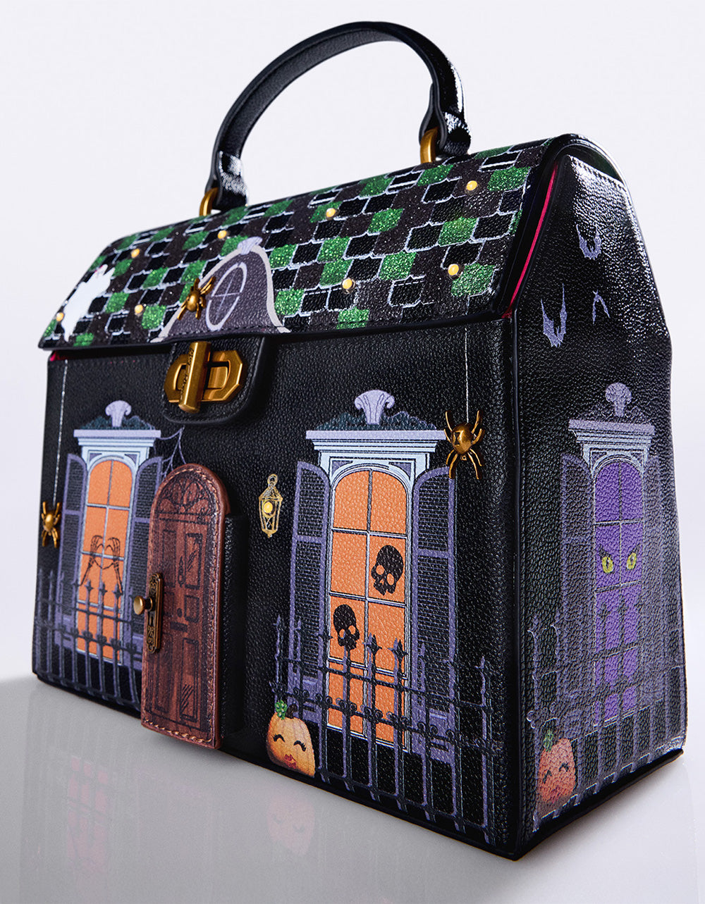 ! Featuring a haunted house theme, this playful accessory adds a touch of eerie charm to your Halloween look. Perfect for carrying your essentials while celebrating the season in style.
