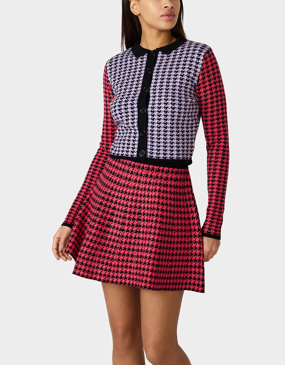 Get ready to turn heads with this hot houndstooth set! Featuring a crisp button-down collar top paired with a flowy skirt in pink and purple houndstooth, this dynamic duo works perfectly together or separately. Mix and match with pieces already in your closet for endless styling possibilities. Whether you’re going for coordinated chic or creative combinations, this versatile set delivers major fashion moments.