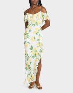 features a playful lemon print, ruffle detailing, and a trendy cold-shoulder design. Perfect for summer nights and adding a touch of fun to any outfit.