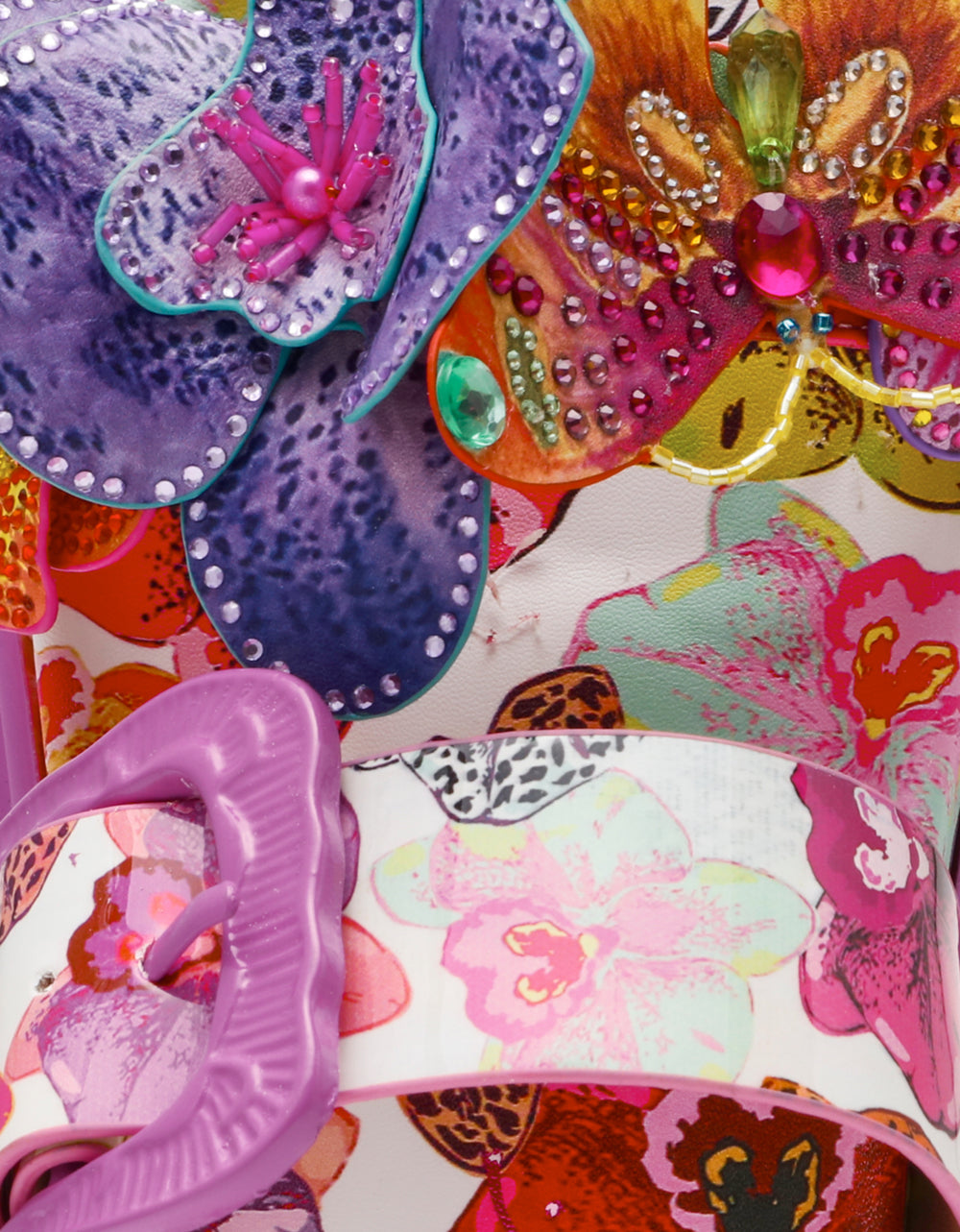 Step into whimsy with the LORAYNE WHITE MULTI sandal—a slip-on style that puts comfort first without sacrificing sparkle. Adorned with dimensional 3D flowers and butterflies, this playful pair shimmers with rhinestone and bead embellishments that catch the light from every angle. A charming buckle detail adds the perfect finishing touch. Perfect for anyone who believes shoes should be as fun and fabulous as they are functional.