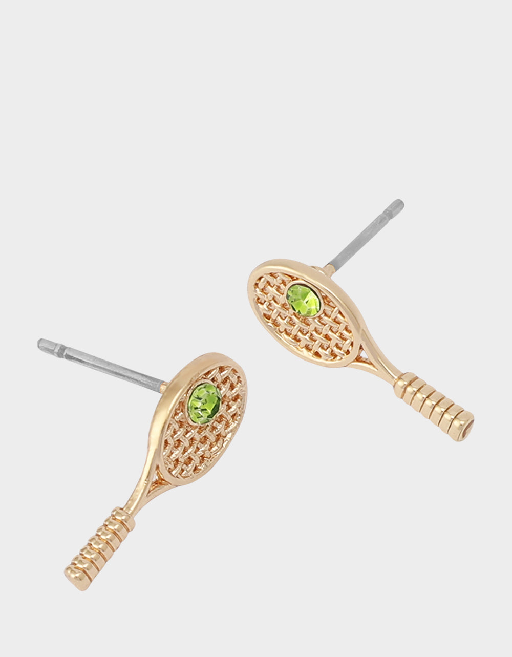 featuring whimsical tennis racquet adorned with green stone tennis ball for a touch of sparkle. Earrings have a post back closure. Made from brass and glass crystal.