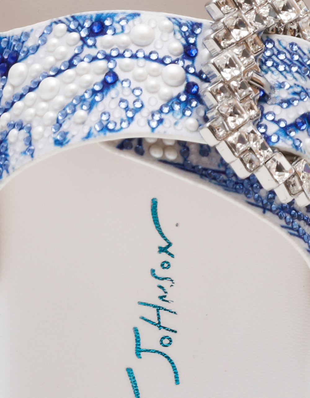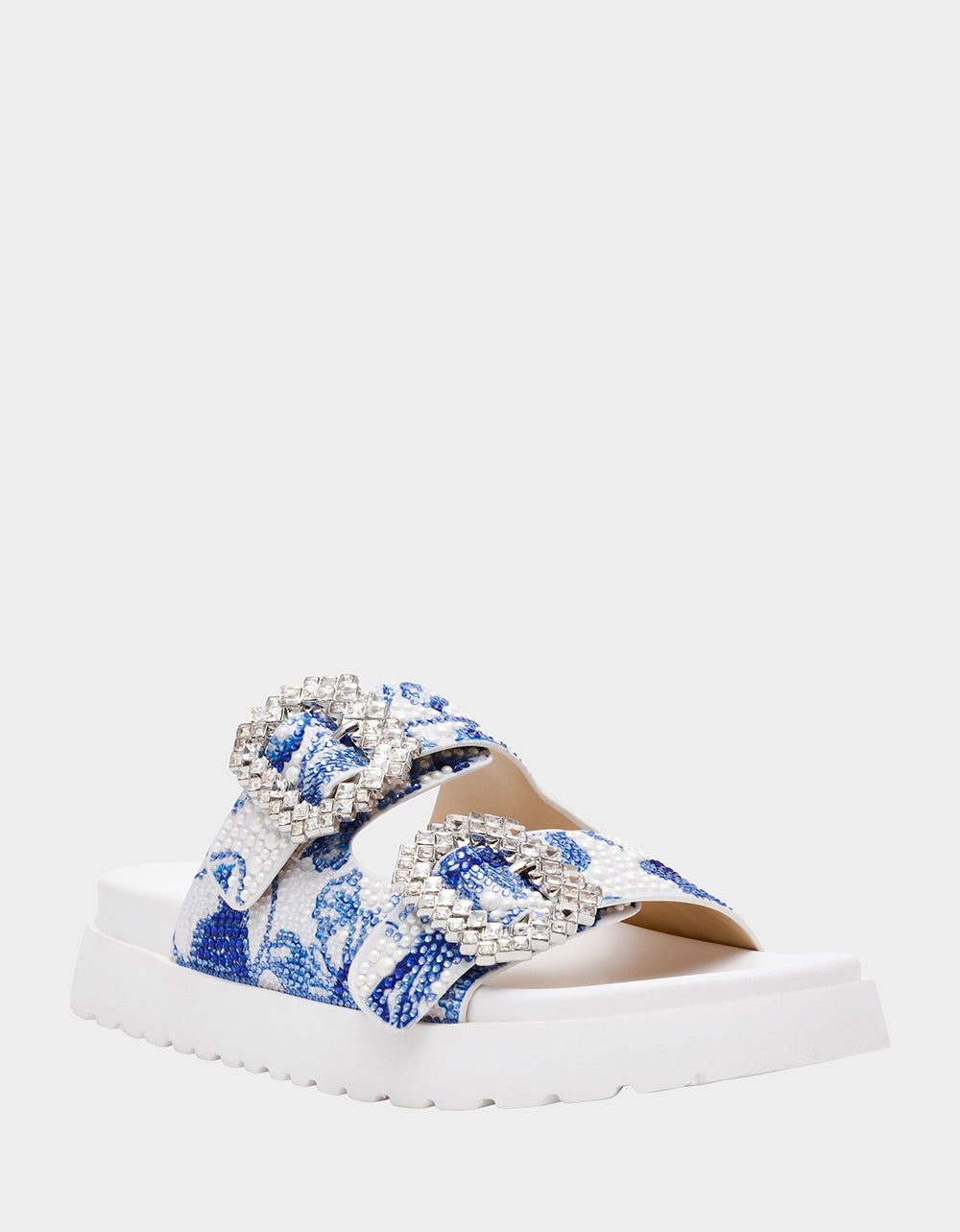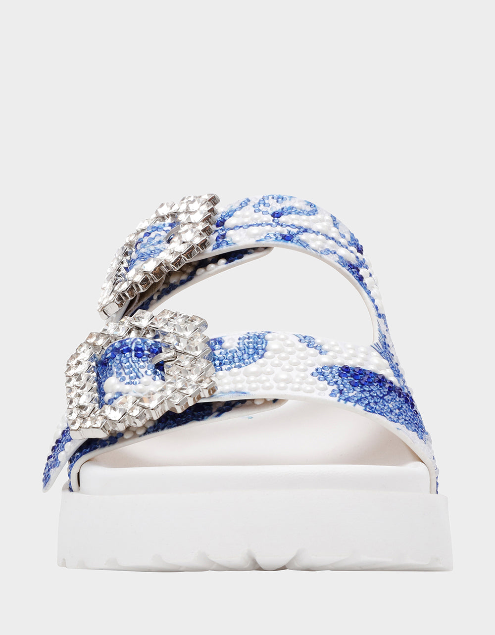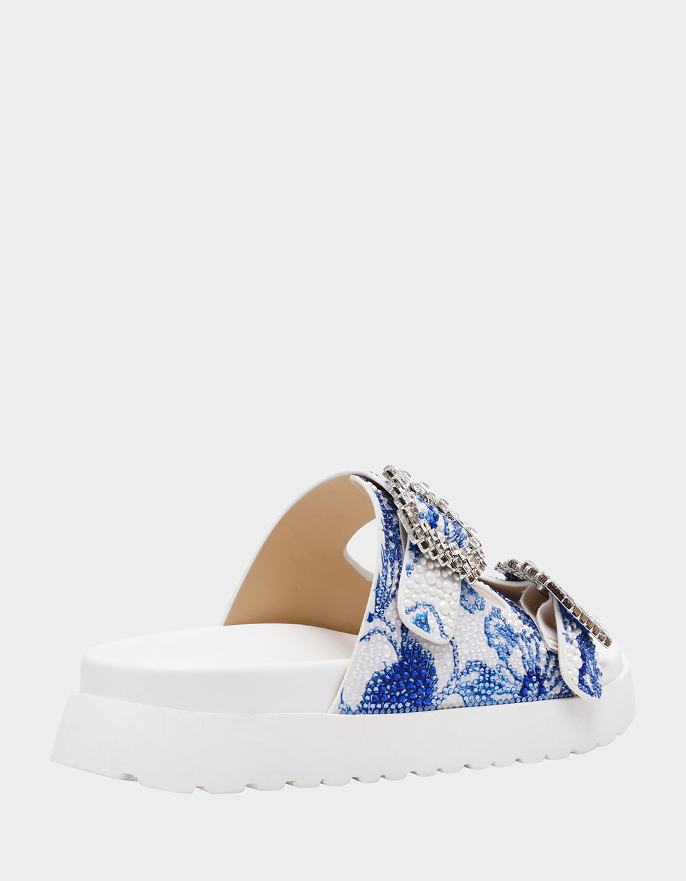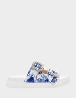 Step into playful elegance with the MATIE WHITE BLUE FLORAL footbed sandal. This slip-on style features sparkling rhinestone buckles and is covered in dazzling rhinestones and pearls for a eye-catching shine. Perfect for adding a touch of fun and glamour to any outfit, these sandals blend comfort with chic flair effortlessly.