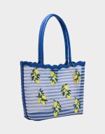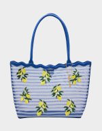 that’s ready for anything. Featuring a charming embroidered lemon design and classic blue stripe pattern, it’s the perfect blend of fun and function. The convenient snap closure keeps your belongings secure while the breathable mesh construction keeps things light and breezy. Whether you’re heading to the beach, market, or just running errands, this tote brings a pop of citrus-inspired personality to your day.