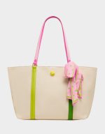 Embrace the art of intentional mismatching with the canvas MISS MATCH TOTE NATURAL MULTI that celebrates bold, eclectic style. Featuring a charming tennis accent, a colorful scarf tied around the handle, and a mix of varying greens against the natural base, this bag proves that clashing patterns and unexpected color combos are totally on-trend. Finished with eye-catching pink straps, it’s the perfect companion for anyone who refuses to play it safe with their accessories.
