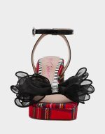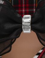 . This festive platform features a striking red plaid and leopard print combo, a comfortable block heel with sparkling rhinestones, and a playful bow adorned with bling on the front. Perfect for adding fun flair to any outfit!
