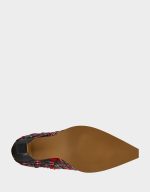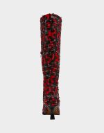 Looking for a must-have addition to your wardrobe? Check out the PAMELLA in red multi plaid print! This tall boot features a sleek tweed material, pointed toe, and playful pattern. Don’t forget about the shiny kitten heel for added style and versatility!