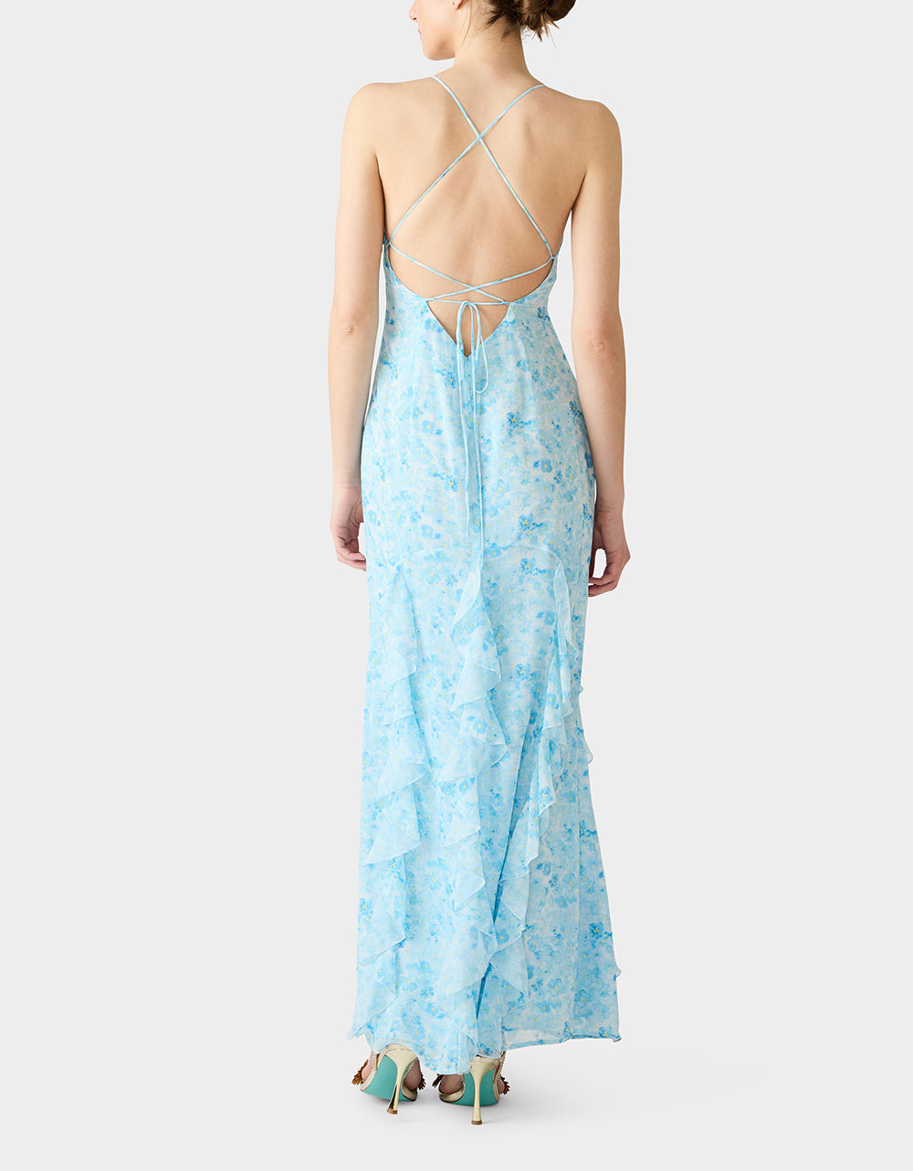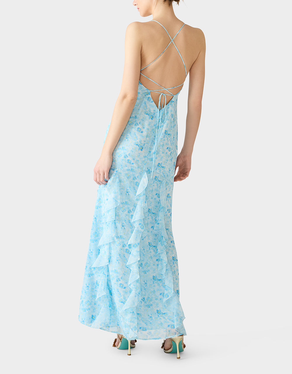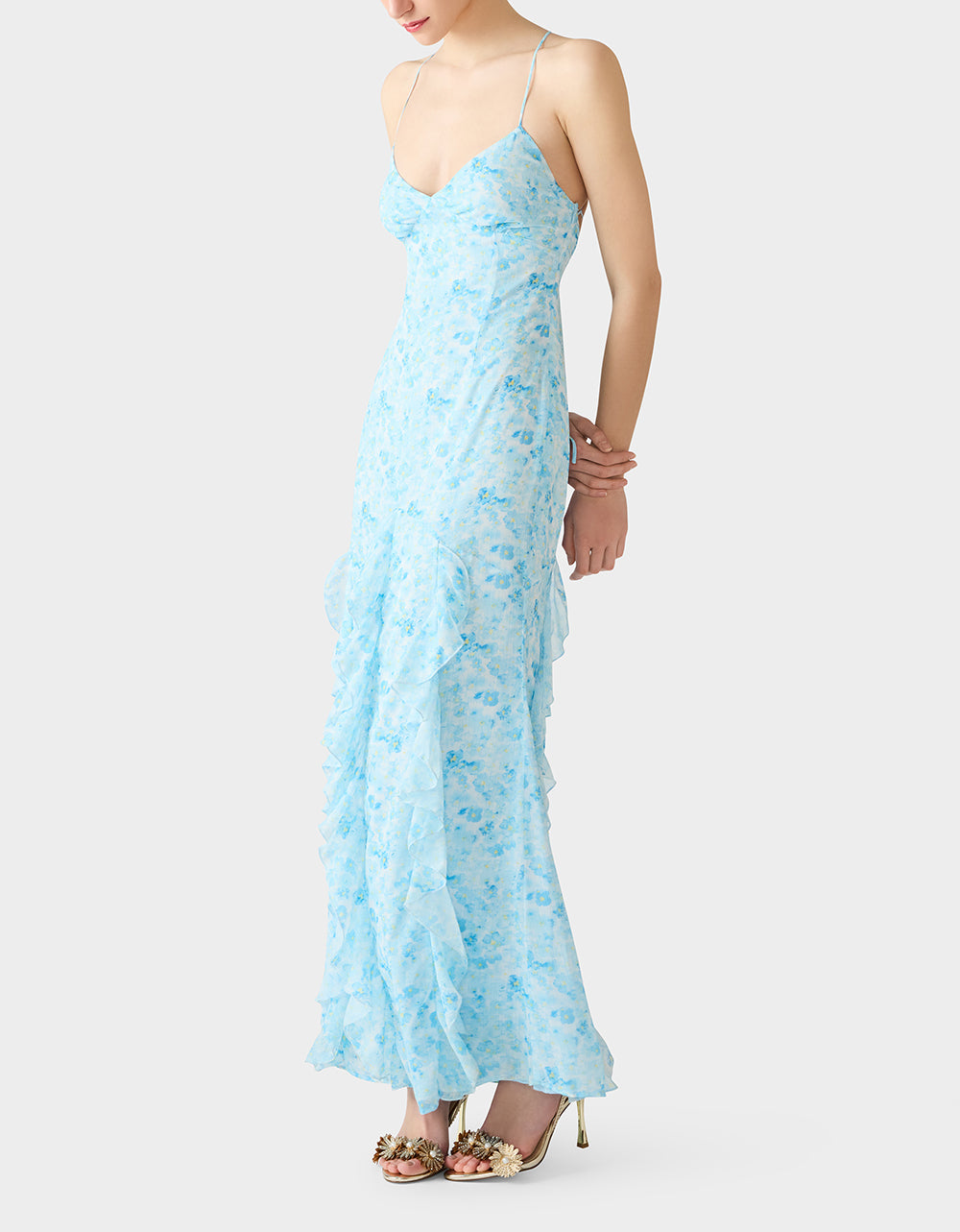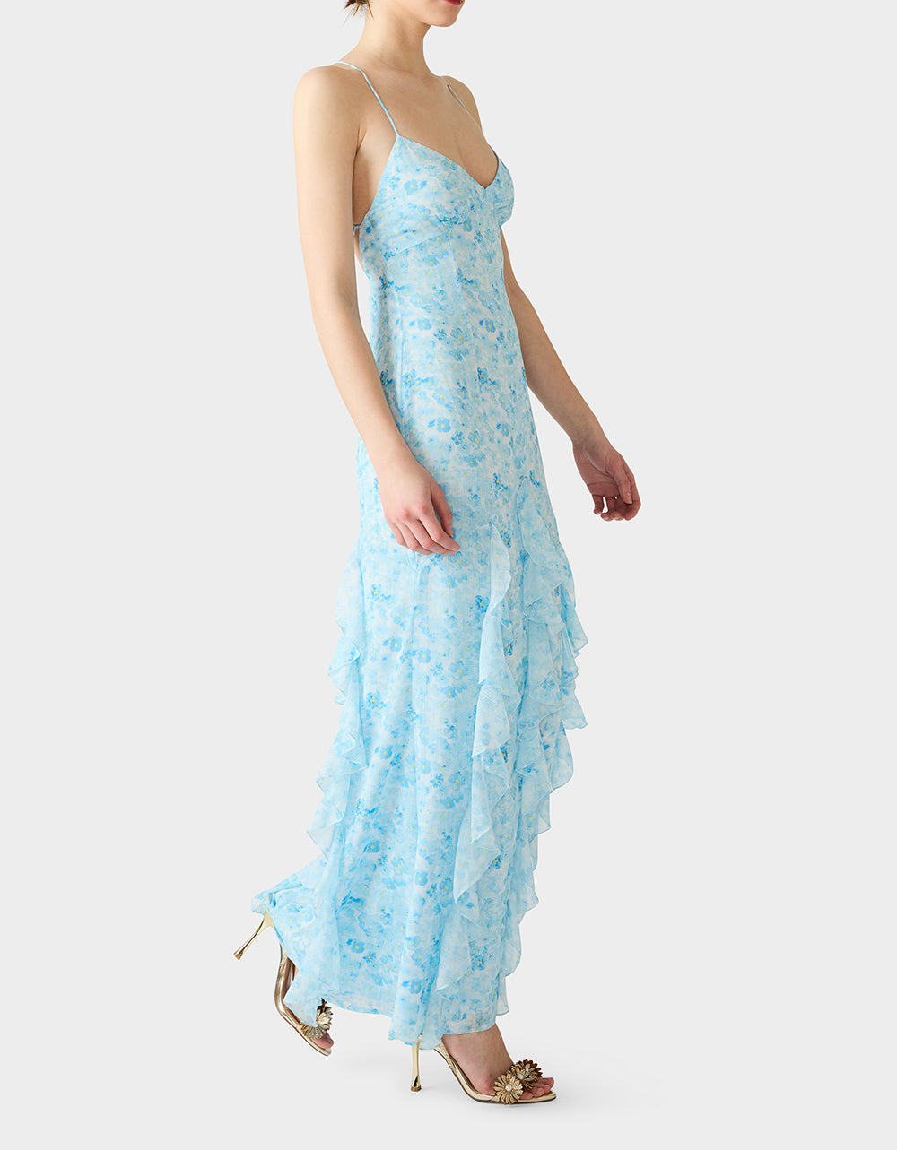 Meet your new go-to gown for those moments when you want to feel absolutely fabulous. This maxi stunner features delicate spaghetti straps and a chic V neckline that flatters every frame. The real showstopper? Vertical ruffles that cascade gracefully to the floor, creating movement and dimension with every step. In a gorgeous blue floral print, it’s the kind of dress that makes you feel like the main character. Effortlessly elegant, undeniably fun.