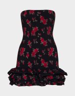 Twirl into the spotlight in this adorable ROSIE POSIE DRESS BLACK! Featuring a charming rose print on a flattering strapless silhouette, this mini dress brings instant fun and flirtation to any occasion. Cascading tiered ruffles dance along the hem, adding movement and playful dimension. Perfect for date nights, parties, or whenever you want to feel fabulous and feminine. A Betsey Johnson essential that celebrates bold style and carefree confidence.