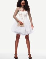 features a sparkling rhinestone-embellished corset top that adds a touch of glam. The sheer tulle bottom skirt creates a light, ballerina-inspired silhouette perfect for twirling the night away. Ideal for making a dazzling statement at any event.