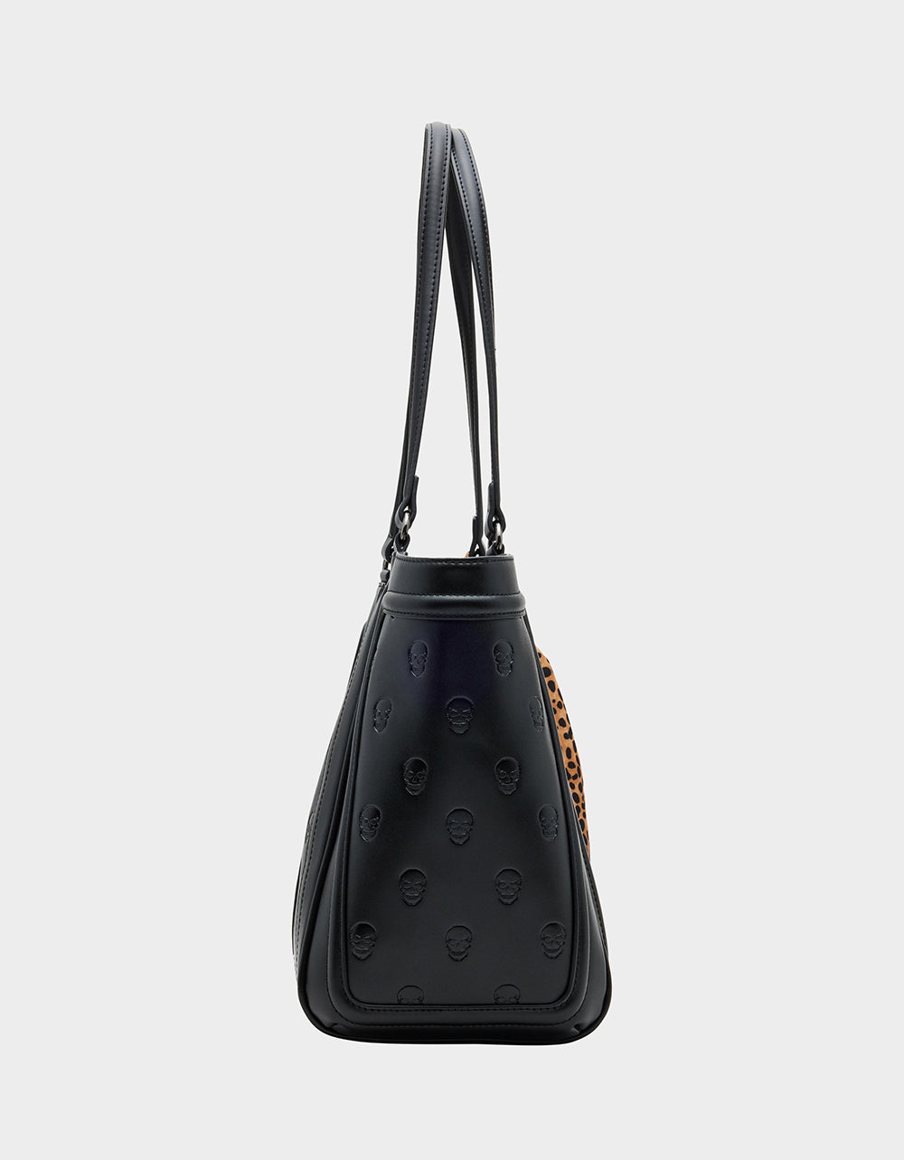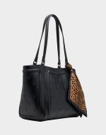 Carry your essentials in style with the SKULLICIOUS TOTE WITH SCARF BLACK. This playful tote features a skull print and a removable leopard print scarf that adds a pop of boldness. Inside, find a convenient back wall zipper pocket to keep your valuables secure. Perfectly sized for everyday use, it’s the go-to bag to add a little edge and fun to your daily routine.