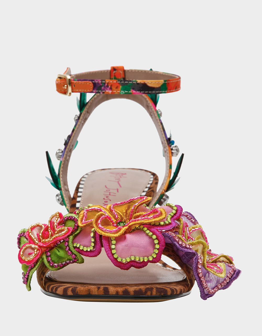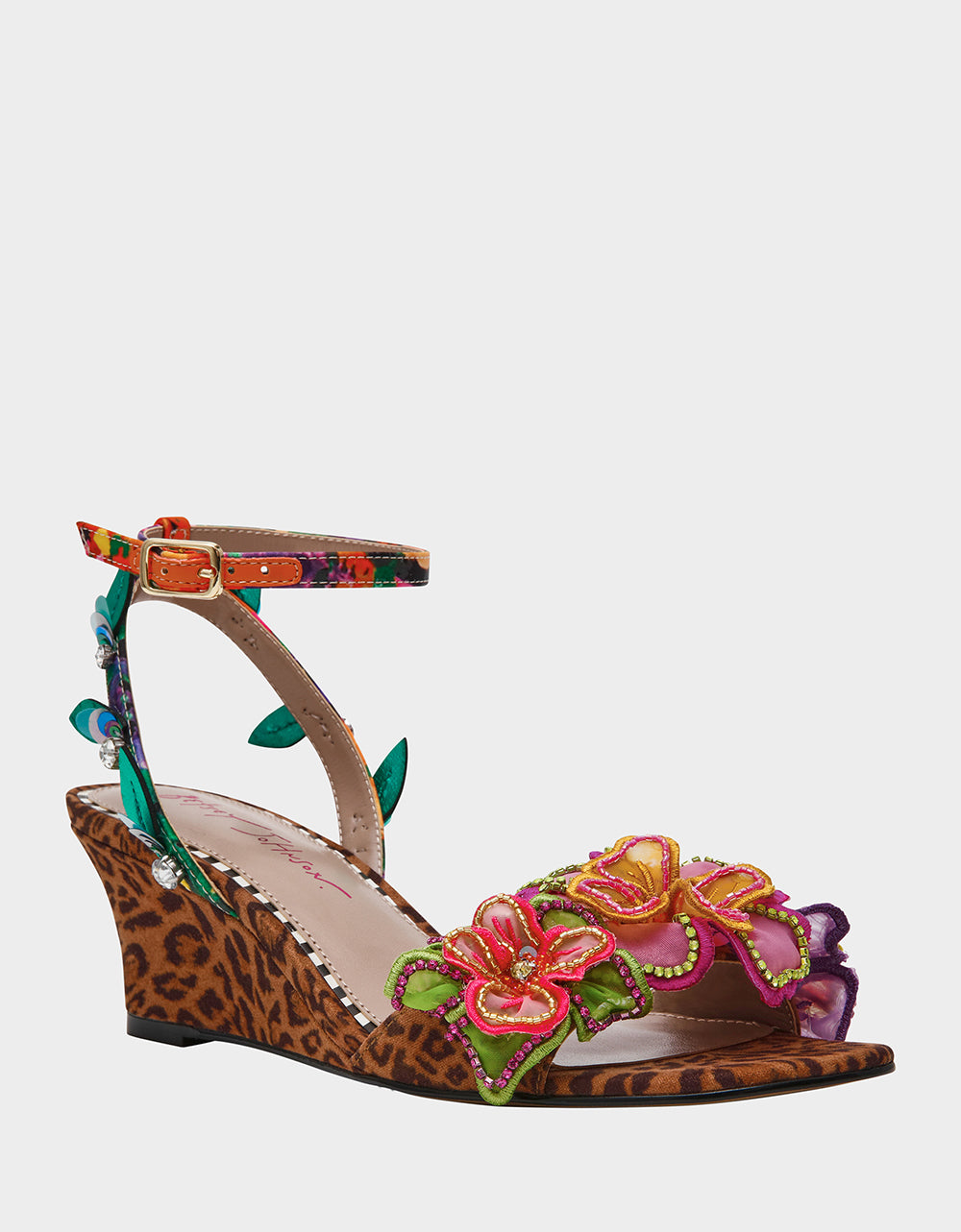 is a total showstopper, complete with a secure ankle strap, 3D flowers, and beaded details that sparkle across the upper. The leopard print base mixed with vibrant floral embellishments creates an instantly recognizable look that’s equal parts playful and polished. Comfortable enough for all-day wear, this is the heel that lets your personality shine through with every fabulous step.