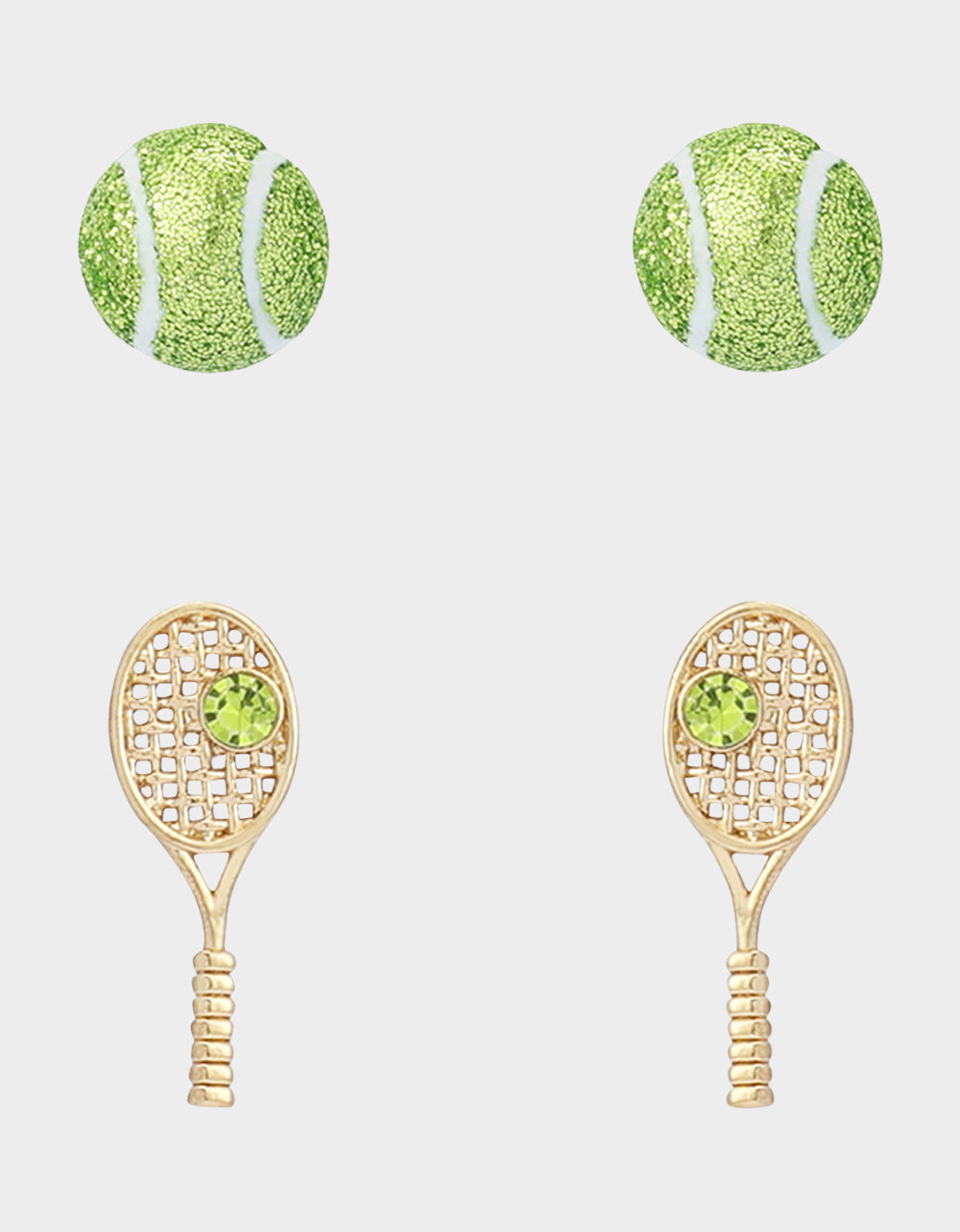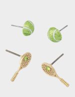 set featuring tennis ball and coordinating tennis racquet. Adorned with delicate green stone for a sparkly touch. Set includes two pairs of earrings to mix and match perfect for everyday. Earrings have post back closures. Made from metal, plastic and glass crystal.