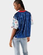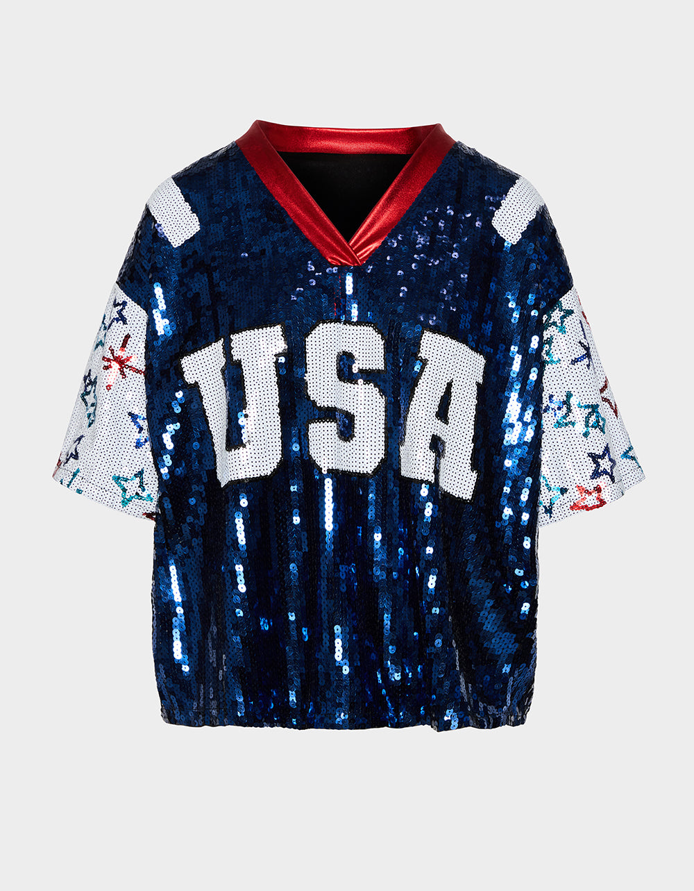Rock your patriotic pride with this USA Jersey in bold blue! Covered in shimmering sequins from top to bottom, this playful piece features stars adorning the sleeves for that classic red, white, and blue spirit. Whether you’re cheering at the game or celebrating Independence Day in style, this dazzling jersey brings the sparkle and the patriotism. Perfect for showing your team spirit with serious shimmer.