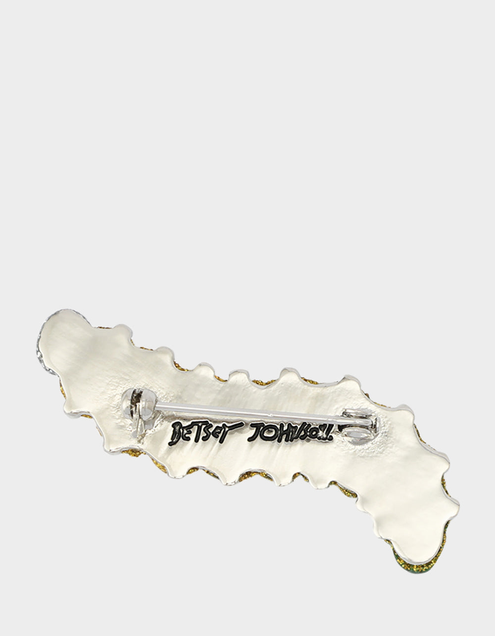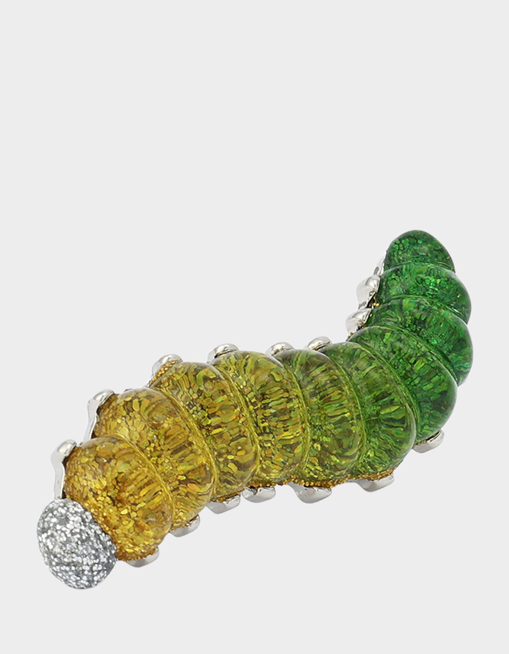 featuring playful worm silhouette with green ombre details perfect for an everyday statement. Brooch has a standard pin closure. Made from metal and plastic.