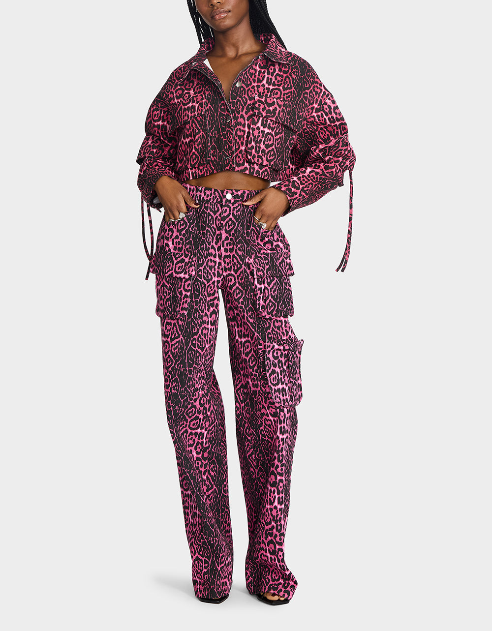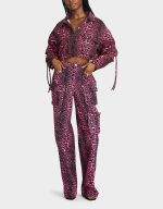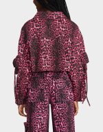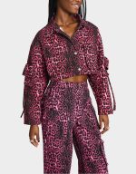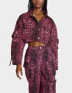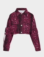 ! This playful piece features a leopard print design on a cargo denim jacket, complete with a collared neck and long sleeves. Perfect for adding a touch of fun to any outfit!